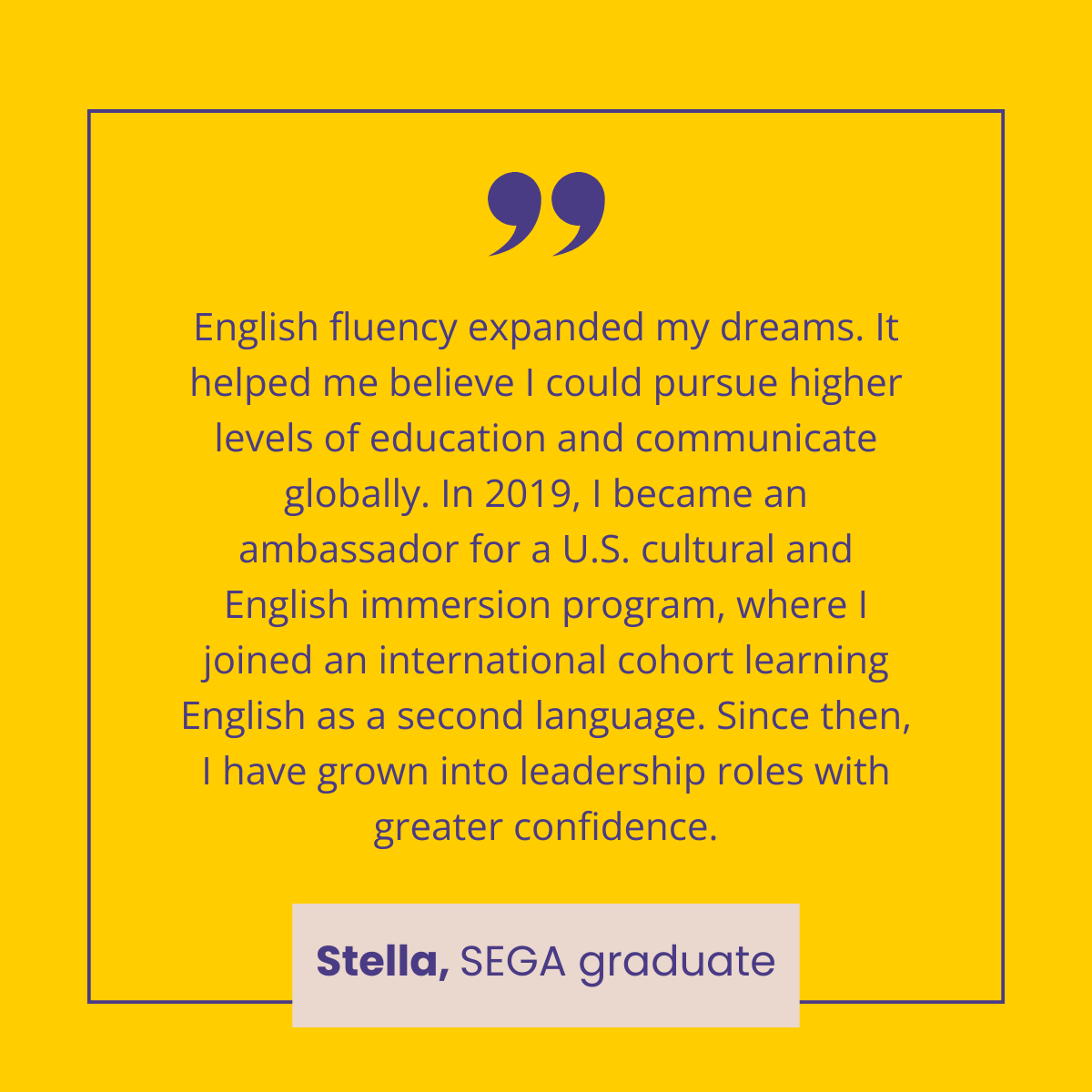 “SEGA played a key role in my growth and my future,” Stella reflects. “Returning as a Teaching Assistant allowed me to support girls the same way I was supported, while also serving as a mentor and role model to my SEGA sisters.”